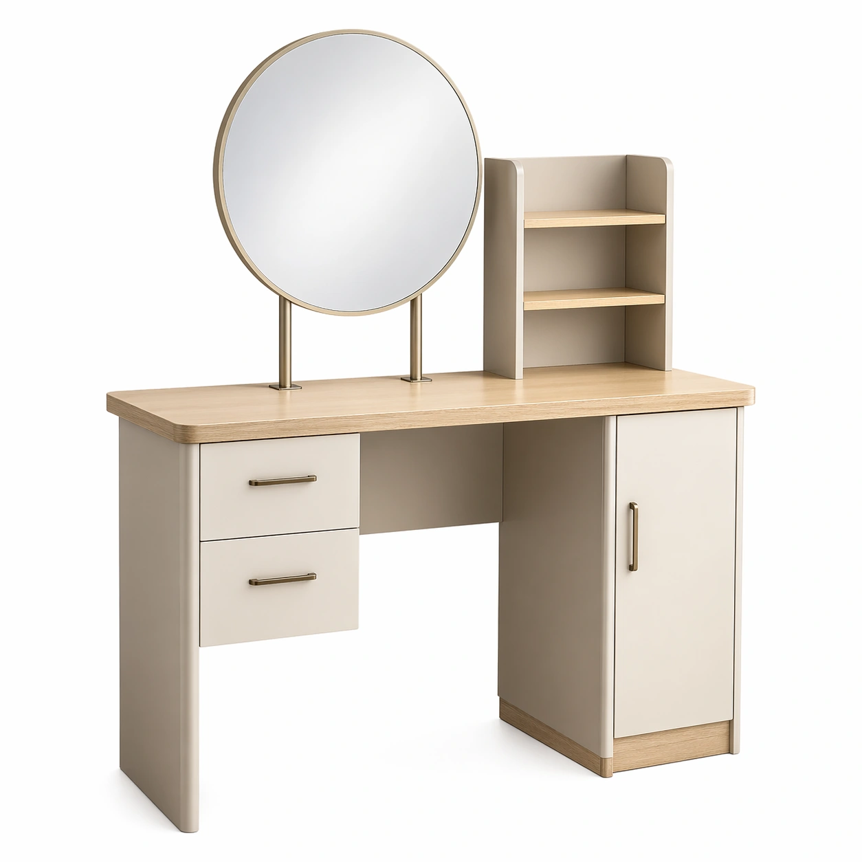 Runder Spiegel, 2 Schubladen, 2 Regale, 1 Schranktür.