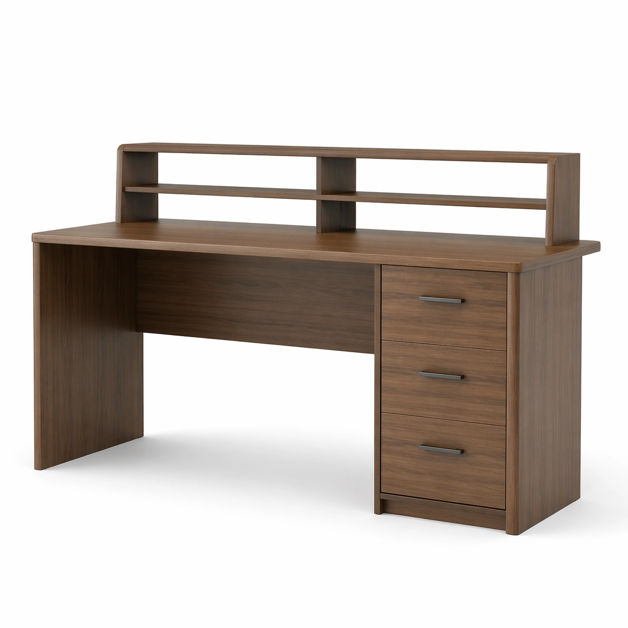 Der Schreibtisch besteht aus einer robusten Holzspanplatte und bietet eine stabile Arbeitsfläche.
