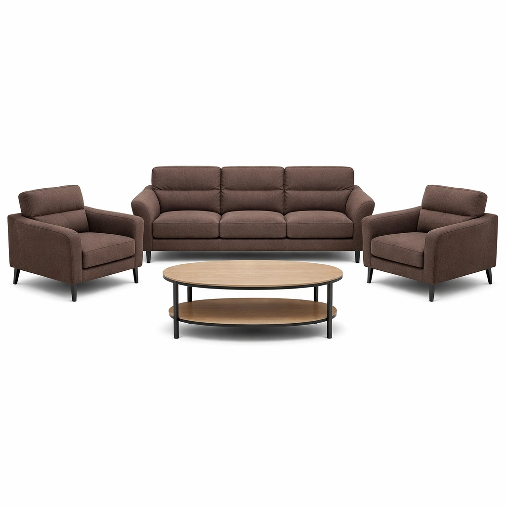 Material: Sofas und Sessel: Polyestergewebe, Polsterung: Polyurethanschaumstoff, Beine: Metall; Couchtisch: Eichenfurnierplatte, Gestell: Stahl