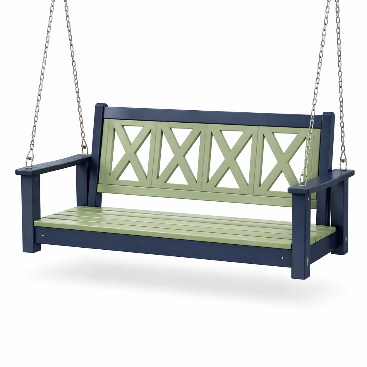 Diese Hängeschaukelbank besteht aus blau und grün lackiertem wetterfestem Holz. Die Abmessungen sind 150 cm in der Länge, 60 cm in der Breite und 45 cm in der Höhe. Die maximale Belastung beträgt 250 kg.